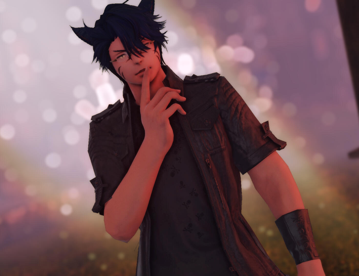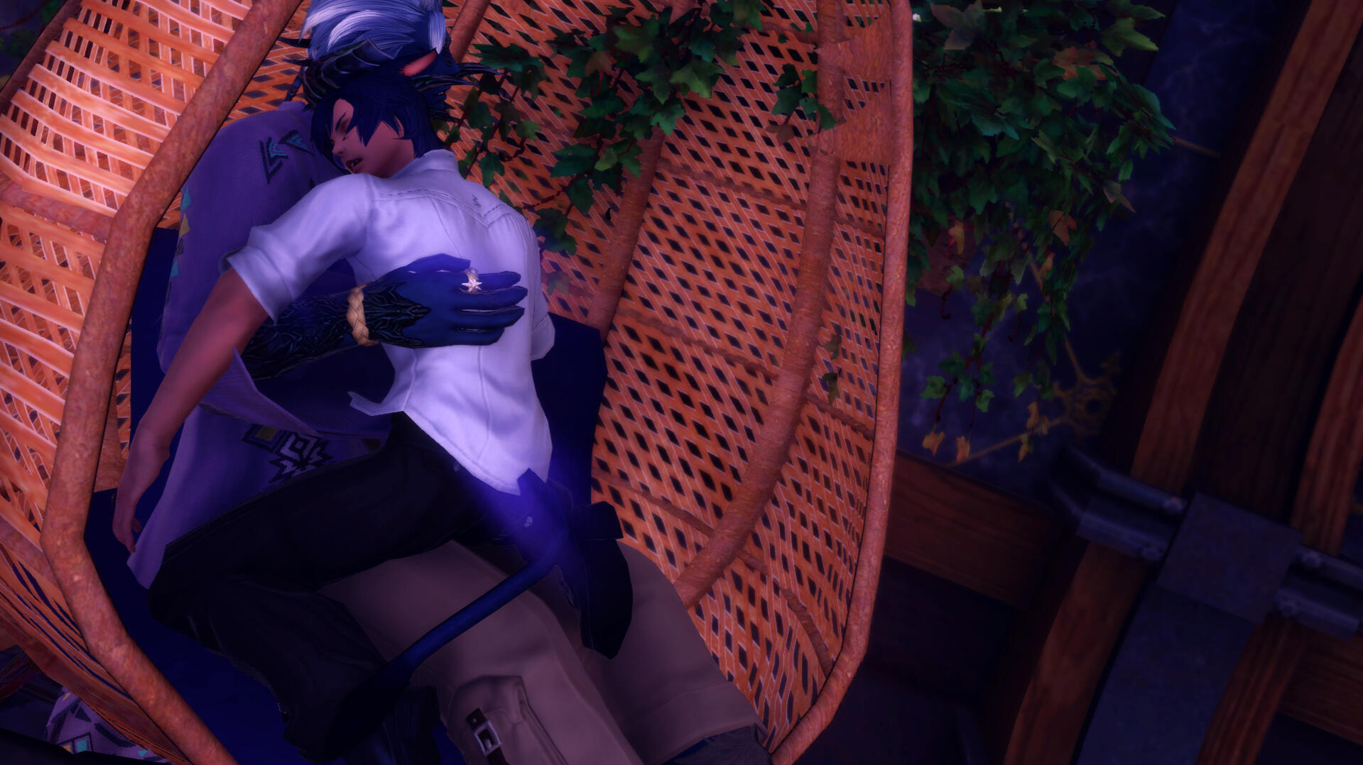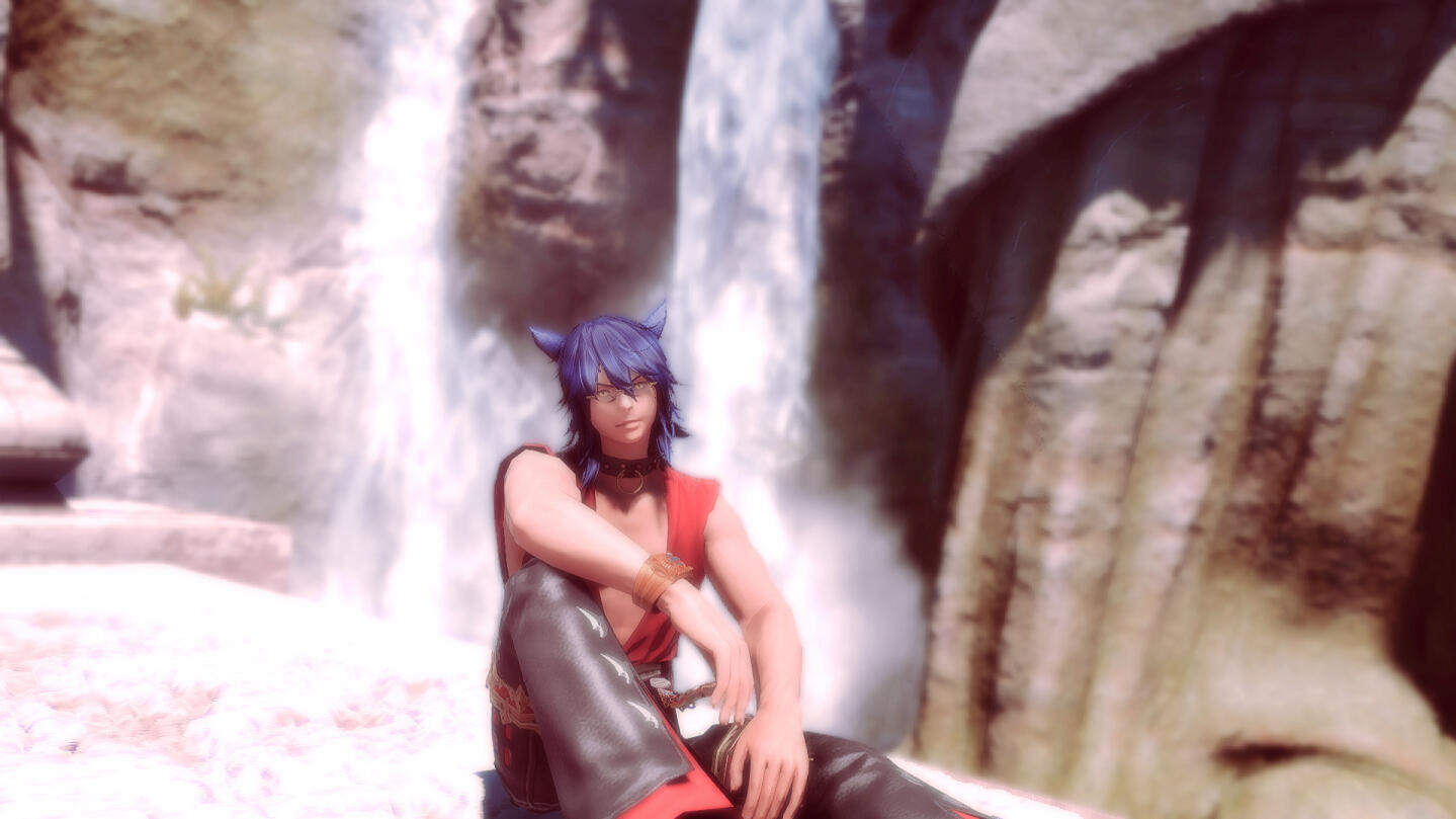 In Limsa he continued on to his old ways, playing music for enough gil for an inn room. He continued on like this for years, returning to Ishgard every few months to check in with the innkeep. After a while he lost hope and began to check the graveyard nearby as well. It's there one year that he meets Leksi, in front of a grave that held a sword and shield against it. She realized what he was doing to himself very quickly and took him in, mothering him back to full health and scolding him.Since being taken in by Leksi he has learned to control the aether around him to a degree. His in game class is a hybrid between Bard and Black Mage, mostly Black Mage, albeit a weak one at that.