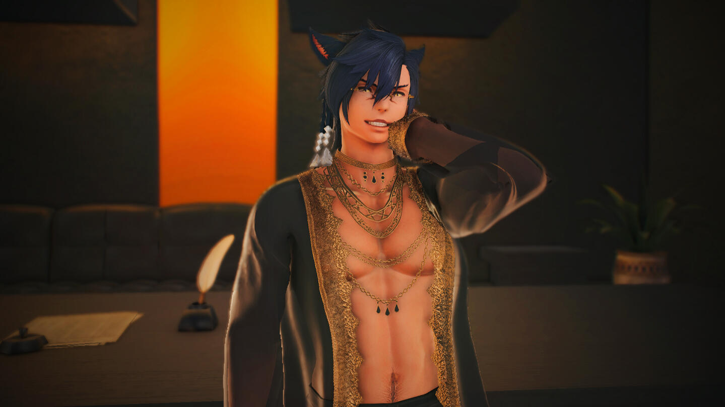 Born an Elezen in Ishgard, his parents were travelling minstrels while he was growing up so he never really called one place home. He learned how to play many instruments from them and even learned many different dances. Somewhere in his teens he lost his parents in a fire, unable to save them as they were pinned under a falling beam and burned alive in the tavern they were playing in. Now alone and only with Minato by his side, Shato took it upon himself to earn gil for the both of them and in any way possible. He first took up barding, making a name for himself in the major cities but despite his tries he was unable to make enough gil for himself and Minato to live on. Seeing no other choice and to protect his younger twin brother, he started to sell himself on the streets, not even caring who used him as a cocksleeve. He was raped and drugged many times while he was selling himself on the streets, he himself jokes it's a miracle he isn't addicted to anything (though he had to face the withdrawal symptoms of K once already). One client kept Shato drugged throughout all of their encounters, keeping him complacent and pliant, even going so far as to threaten his brother with the same treatment. This went on for many years, unbeknownst to his brother until one of Shato's clients (A hyur merchant named Alric Kantor, the same one that drugged Shato regularly) mistook Minato for Shato. Shato was able to save Minato before anything happened and Alric grew very upset with Shato that he had his pet Couerl attack Shato, giving him the deep scars that permanently mar the left side of his abdomen. However, his brother became very wary of strangers after that, only letting his brother touch him. It took a long time for Minato to open up to another's touch.After that, Shato stopped taking clients in that way, making a lot of them angry that they had lost their favorite whore. Him and Minato fled to Ishgard where they stayed for a while, playing their songs there until the Calamity hit. Some time during the Calamity, Shato lost Minato and was unable to find him. Months pass and Shato gave up the idea of waiting for his brother. Afterwards he left a note with the innkeep telling her he was going back to Limsa and for his twin to meet him there if he ever came looking for him.In Limsa he continued on to his old ways, playing music for enough gil for an inn room and when he couldn't make ends meet he sold himself once again on the streets to the first available client that would take him. He continued on like this for years, returning to Ishgard every few months to check in with the innkeep. After a while he lost hope and began to check the graveyard nearby as well. It's there one year that he meets Leksi, in front of a grave that held a sword and shield against it. She realized what he was doing to himself very quickly and took him in, mothering him back to full health and scolding him for selling himself to people who would harm him like they have.