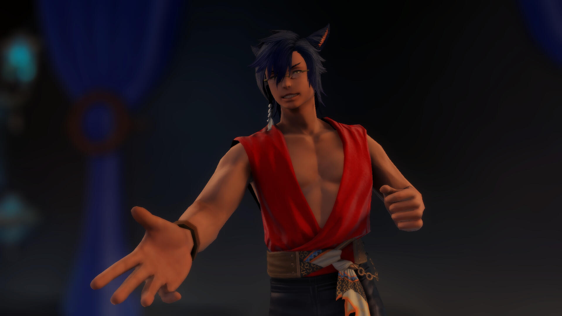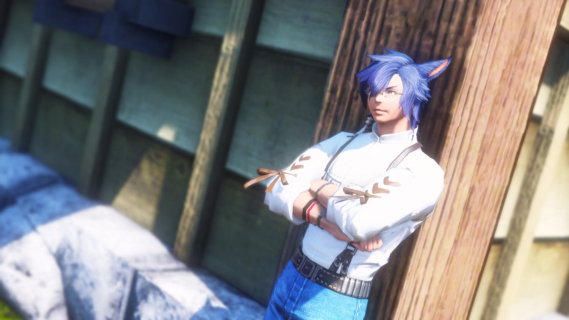 A wild cat at heart. He's been known to go where the wind takes him, which suits him just fine. He's brash, often coming across as an ass at times, but deep down once you can crack his shell he's actually a nice guy.Blue hair that falls to his shoulders and piercing golden eyes, he almost seems uncomfortable in his skin. Not a scar could be seen on his body, that is exposed at least. Under his shirt he does have the scars from the claws of a Couerl on the left side of his abdomen, but he tries to hide it to the best of his ability. His ears and tail often betray his true emotions. He has bad depression and anxiety, despite his best attempts to hide it. He has harmed himself once and only once in his life, vowing to have a safe spot to go to after Minato found him and took the bloody blade from his hands. The wounds were healed by his brother, mercifully erasing the scar they would have left behind on his wrists.