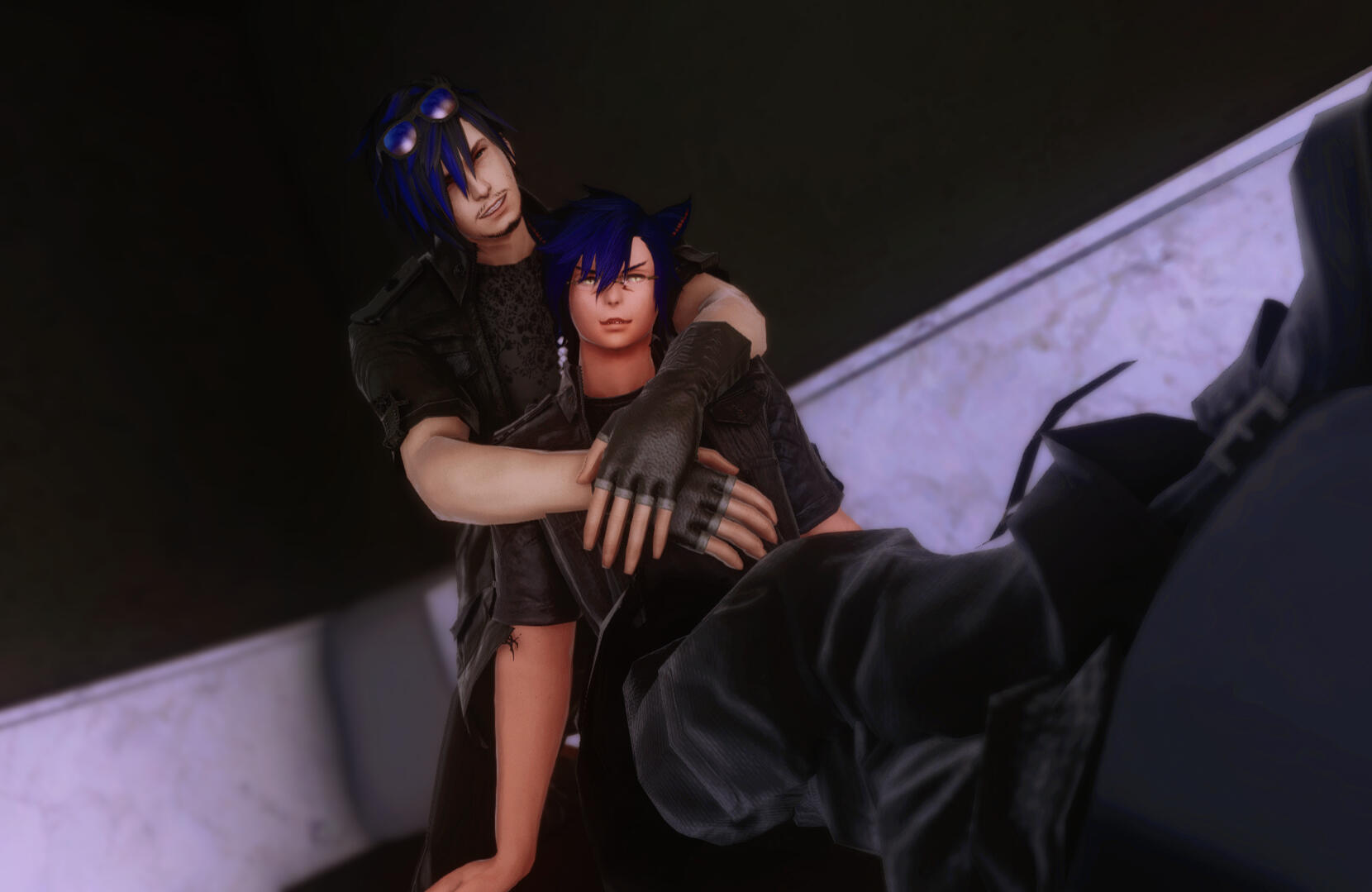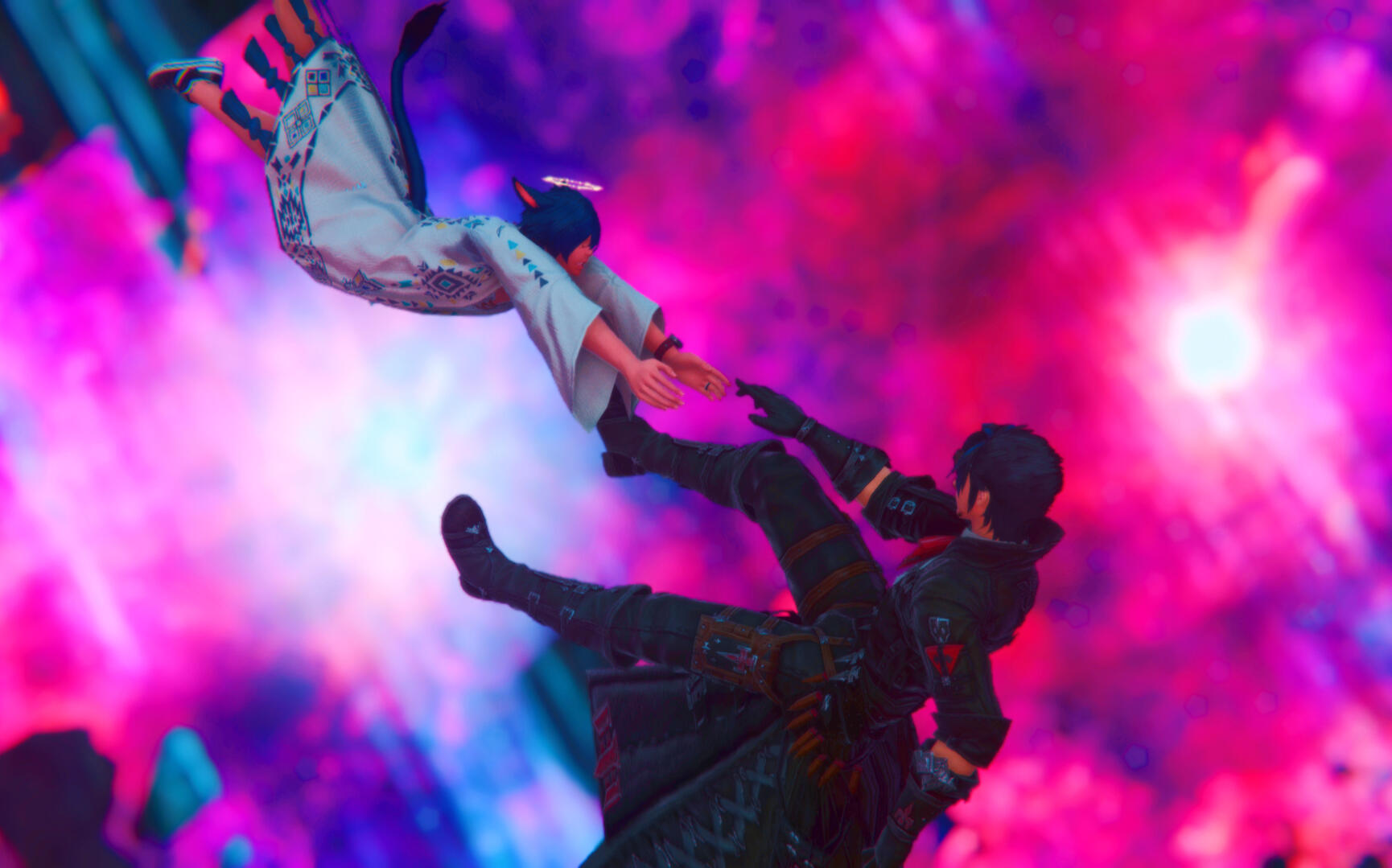 With a routine hunt, a portal opened up near where Shato and Shira were spilling forth a monstrosity from another star. A sin eater it was called, a monster that fed on aether. About to fire off some spells, Shato had stopped mid-spellcast, frozen in fear. Dropping his staff, Shato fell to the floor, a memory had surfaced while fighting the sin eater. One from the calamity and of an Elezen identical in looks to himself being impaled with a falling beam. While Shira was able to save him from a fatal blow while he was paralyzed, the damage had been done, the memory had surfaced, and Shato almost couldn't live with knowing he was alone. He withdrew from the world for a month, even buying his own apartment so he had a retreat.His only constant companion was Shira and was the only one Shato would let near him. Shira cut his hair for him, giving him the look he has now and made sure he was fed and taking care of himself.